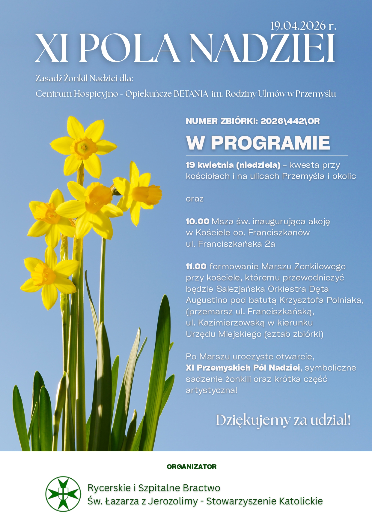 W ramach akcji prowadzona będzie zbiórka funduszy na ten szczytny cel. Ofiary będzie można składać do puszek w dniu 19 kwietnia, po każdej Mszy Świętej.